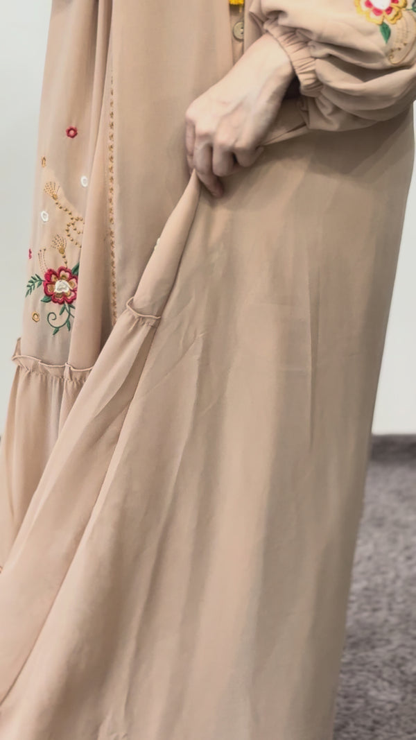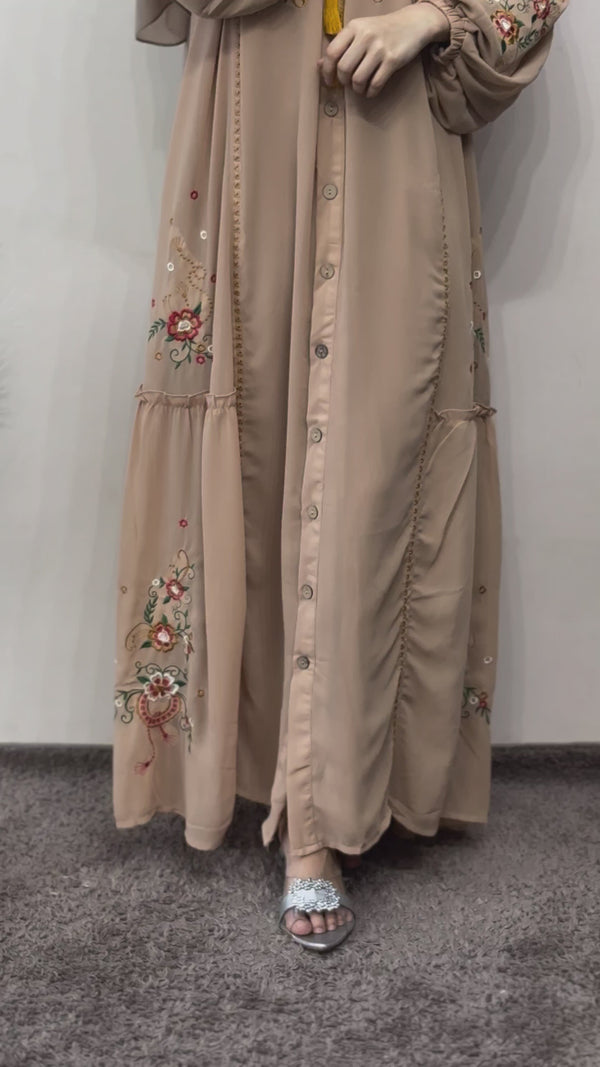 This flared maxi gown is made from Babydoll chiffon fabric. It features colorful floral embroidery on the chest, sleeves, and bottom. The gown has a full button-down front, a semi-collar with tassels, and comfortable loose sleeves. It has a loose fit and is feeding-friendly, making it a great choice for Eid or parties.