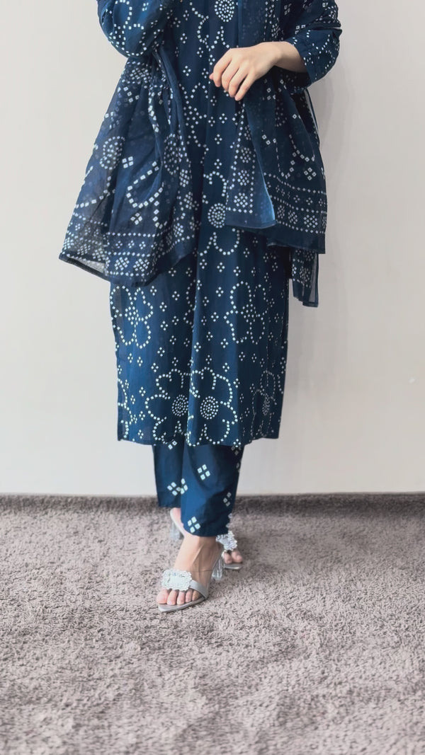 The cotton straight suit is designed for casual wear. This suit is made from premium cotton fabric and has a regular fit. The long length garment features a v-neck with 3/4 sleeves, detailed with an all-over traditional bandani print.