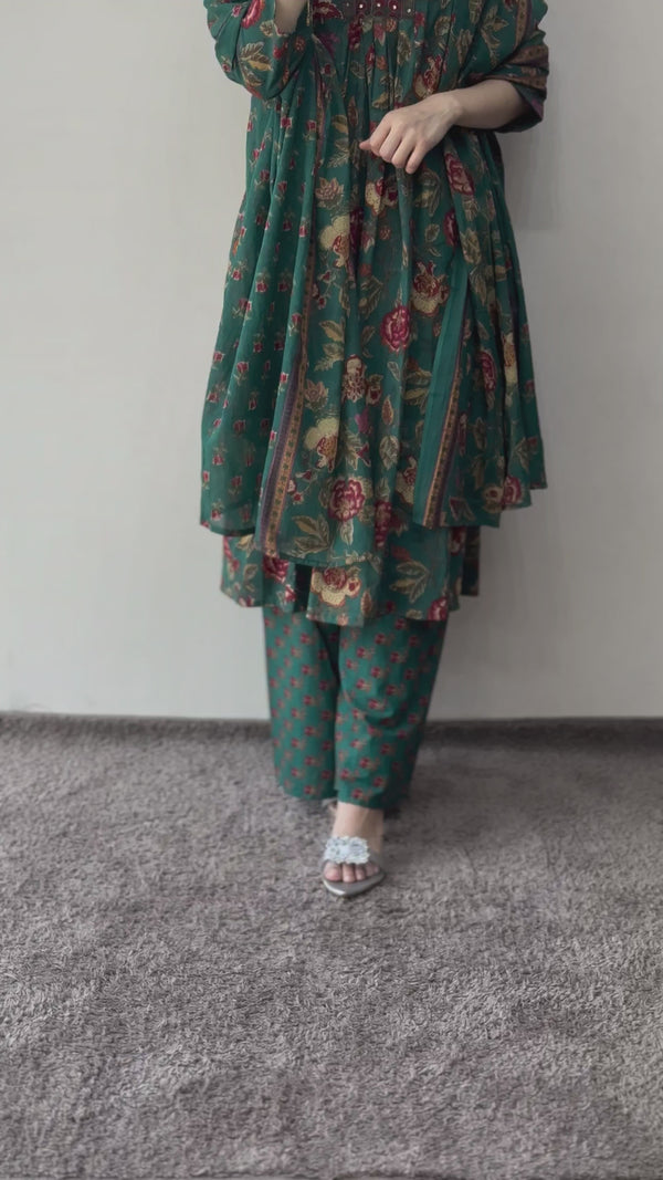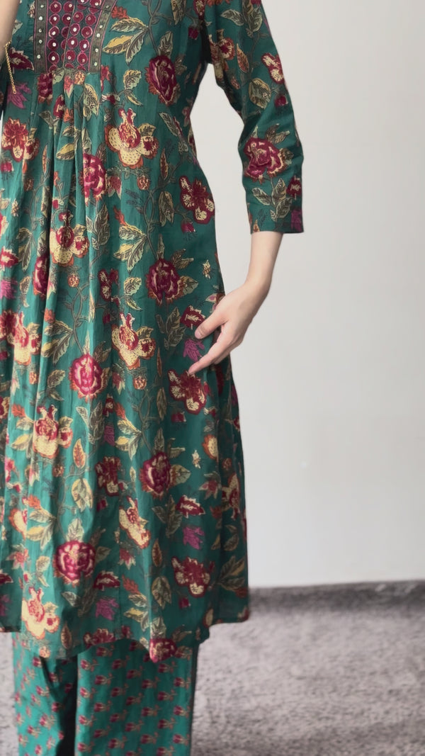 The cotton floral printed anarkali suit offers a regular fit and is designed for casual wear. This mid-calf length suit is made from cotton fabric and features a v-neck with 3/4 normal sleeves. The anarkali cut is detailed with a vibrant floral print and mirror work around the neckline.