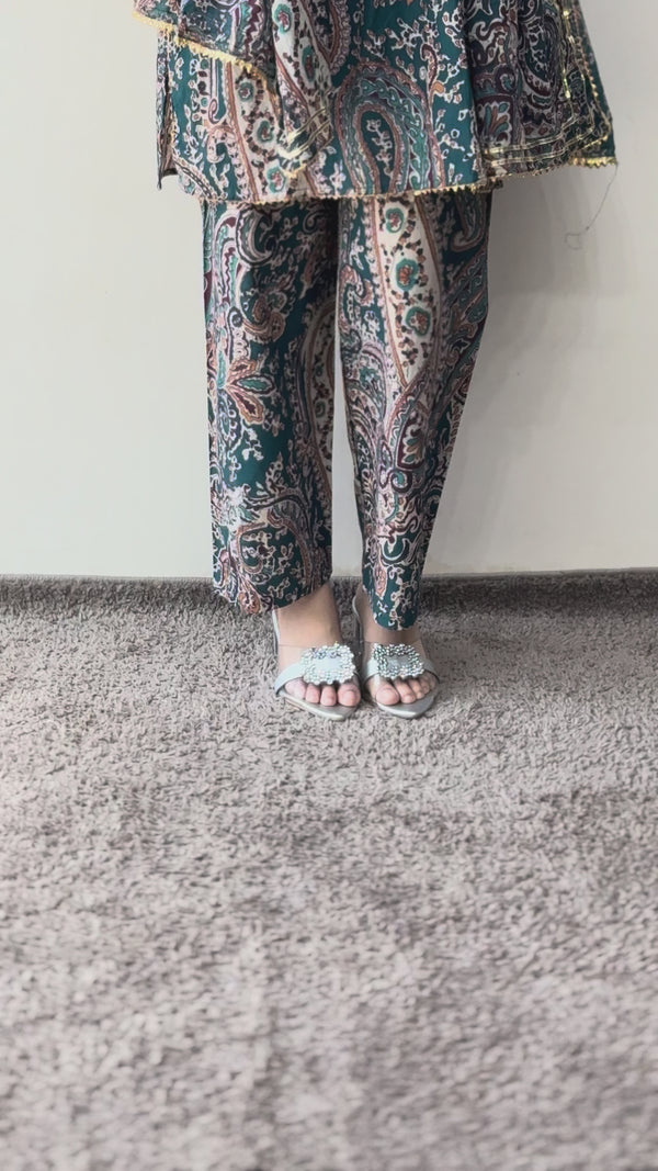 The cotton straight suit is designed for casual wear. This straight cut suit is made from cotton fabric and has a regular fit. The suit includes a short length flared tunic top with long sleeves, paired with matching pants, all detailed with a vibrant paisley print and subtle gold trim.
