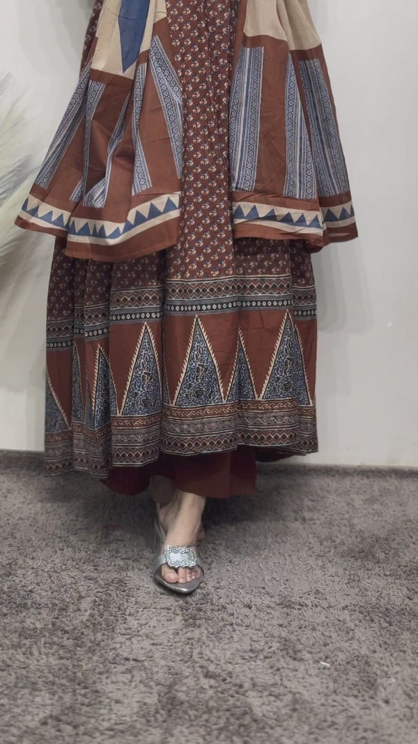 This premium cotton Anarkali suit comes in a rich maroon color and features a vibrant, all-over geometric pattern print. The kurta has a regular fit, a V-neck, and 3/4 normal sleeves. The set includes matching pants and a patterned dupatta with complementary block print motifs.