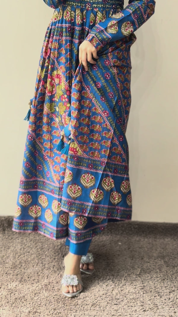 This premium cotton Anarkali suit features an all-over traditional print in royal blue. This maxi length suit has a regular fit, a V-neck, and long normal sleeves. It is suitable for casual and party occasions.
