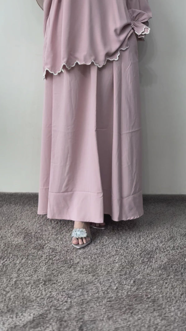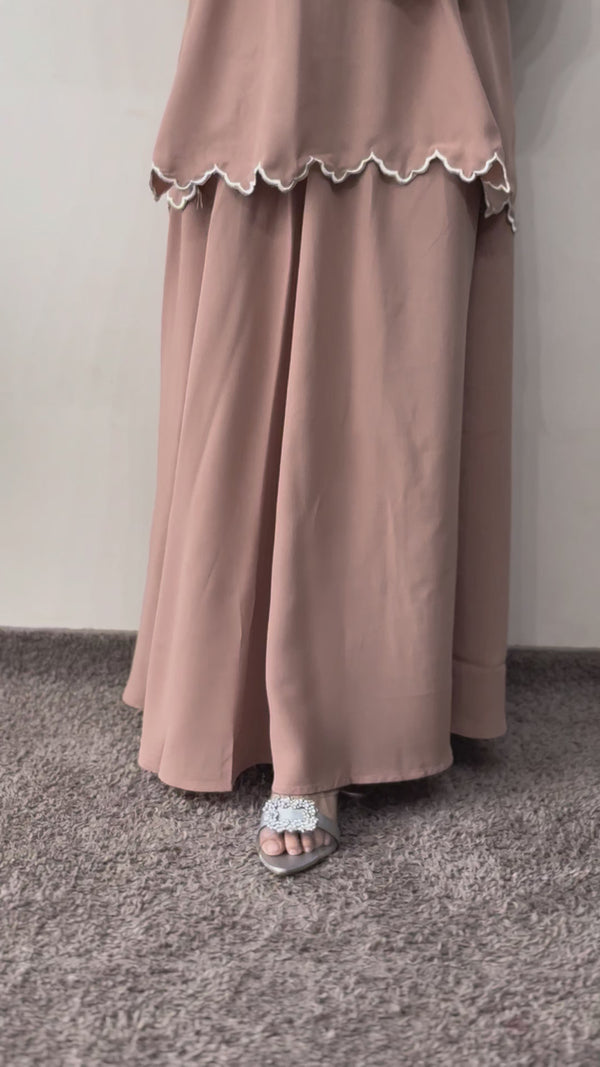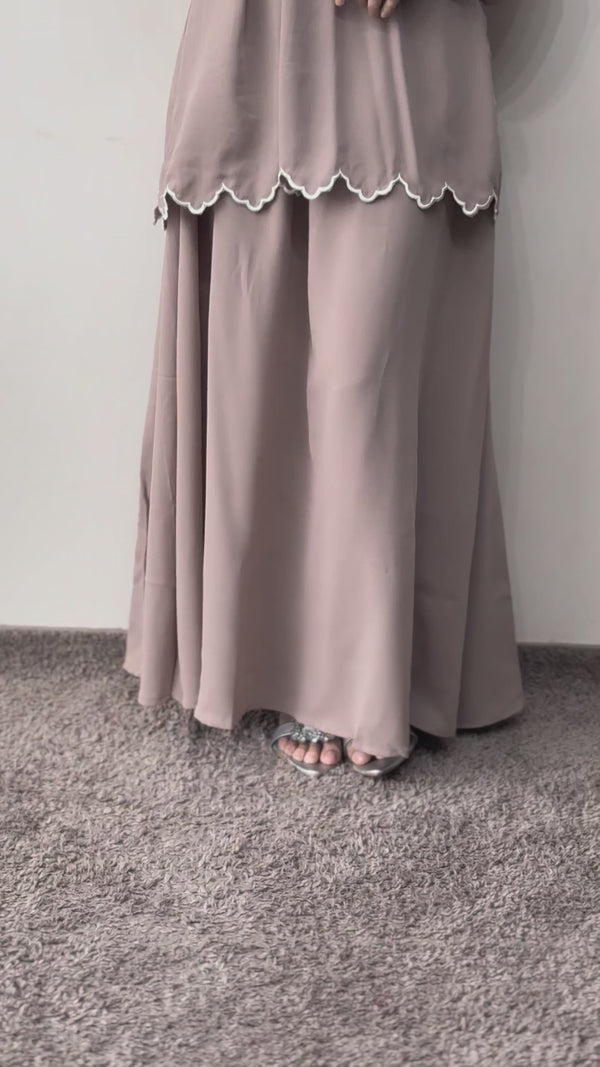 This elegant two-piece co-ord set is crafted from high-quality crepe fabric. It features a top with a distinctive scallop-edged hem and stylish poet sleeves. The set includes a matching midi-length skirt, designed with a comfortable loose fit. It is feeding-friendly and perfect for casual wear.