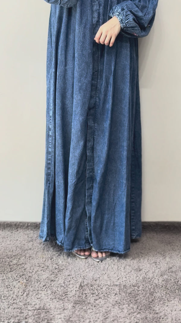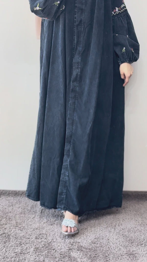 This Denim Sleeve Embroidered Maxi Dress is available in Dark Denim and Black, offering a loose fit up to size 3XL. Crafted from Soft Denim, this Maxi Dress features detailed sleeve embroidery and a button-down semi-collar. The design creates a feminine Fit and Flare silhouette and includes elegant Lantern sleeves with elastic cuffs. The garment is feeding-friendly and suitable for both casual and formal wear.