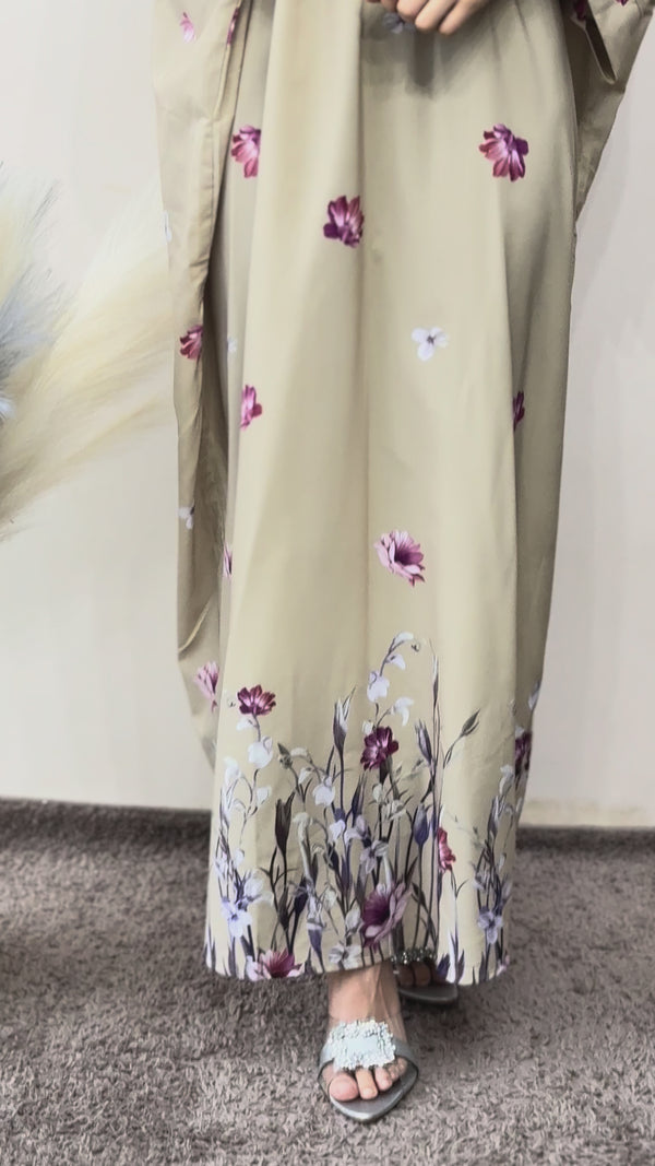 This elegant floral kaftan is crafted from luxurious Dior silk fabric, offering a soft and breathable feel. Designed with a modest fit and flare silhouette, it features a V-neck with a semi-collar and 3/4 sleeves for comfortable coverage. The loose, maxi-length style suits sizes up to 3XL, ensuring versatility and ease of wear. Adorned with delicate digital floral prints, this kaftan is both stylish and refined. Easy to care for, it is suitable for dry cleaning and machine wash, making it a practical yet sophisticated addition to your wardrobe.