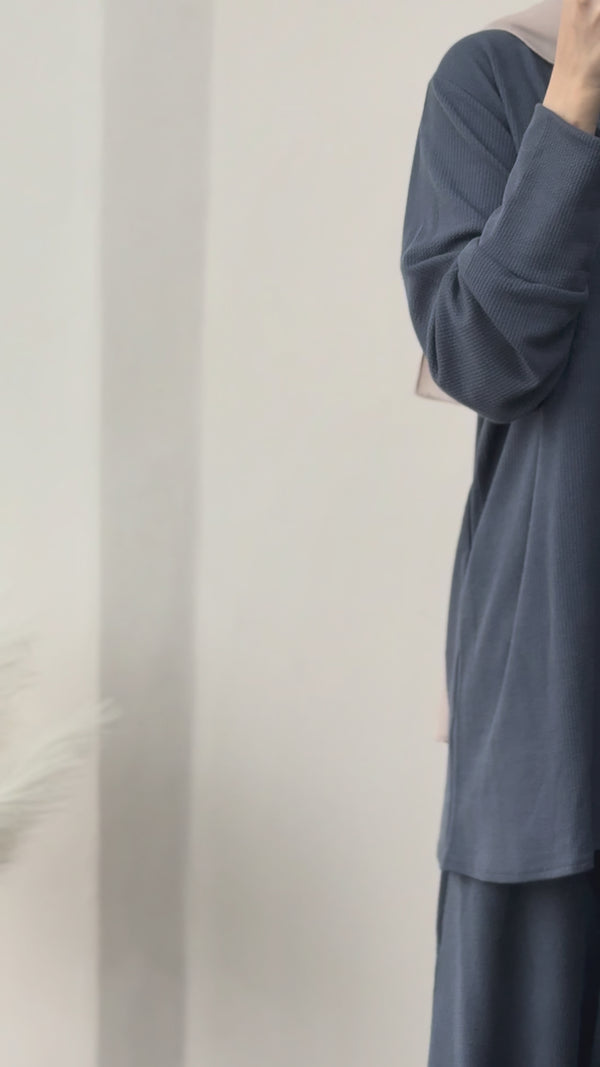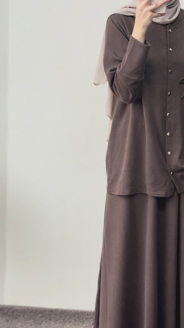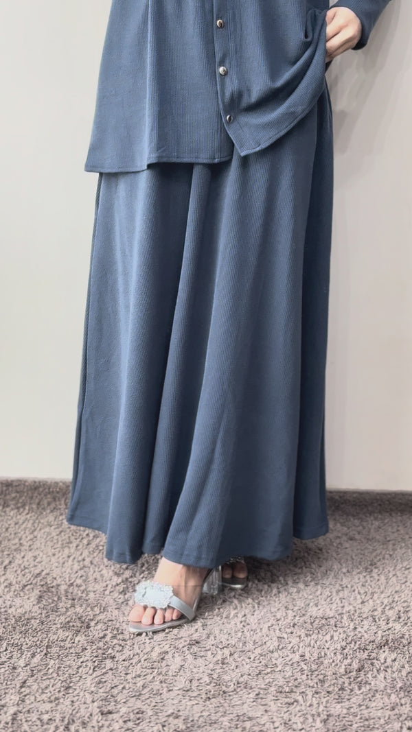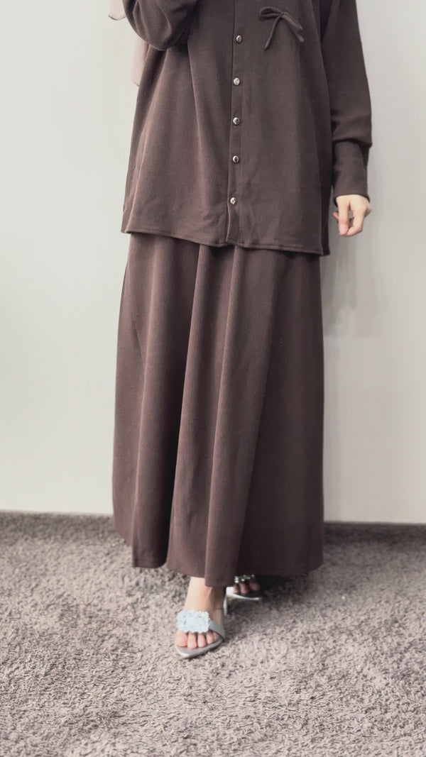 This comfortable knit top and skirt set is designed for a simple, cohesive look. The top is a short, button-down style with a round neckline and long cuff sleeves. It is detailed with small, decorative knot accents on the chest area. The set includes a matching maxi-length skirt and is available in multiple solid color options. This style has a loose fit and the top is feeding friendly.