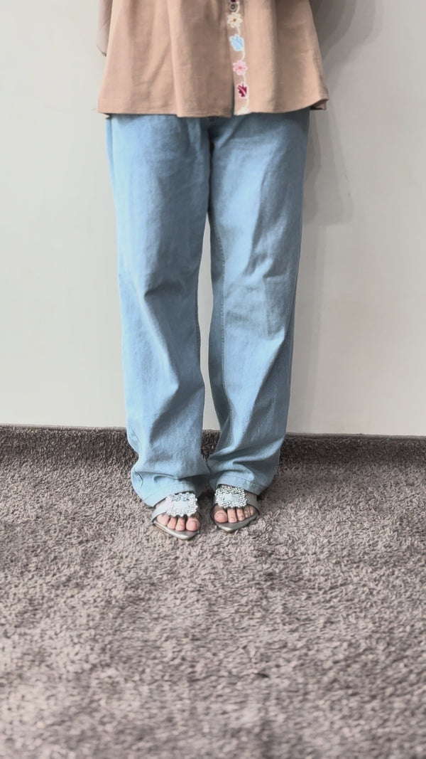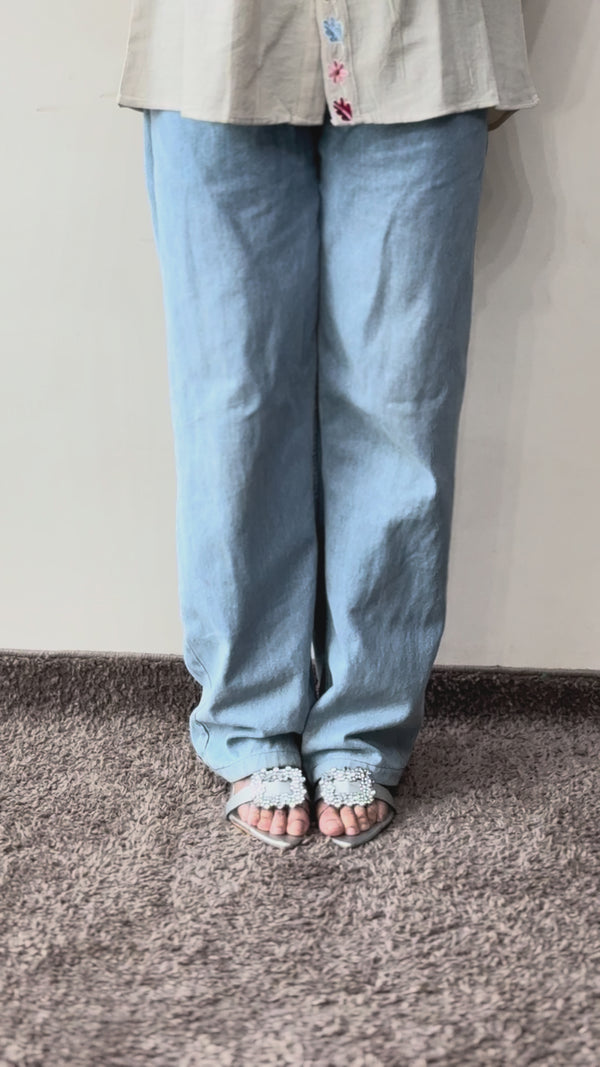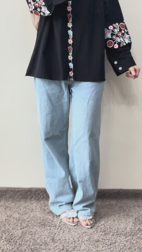 This stylish short-length shirt is made from comfortable linen fabric and features charming colorful circle embroidery and lace trim. This long tunic has a classic collar and a full button-down front, making it suitable for casual or formal wear. This shirt is feeding friendly.