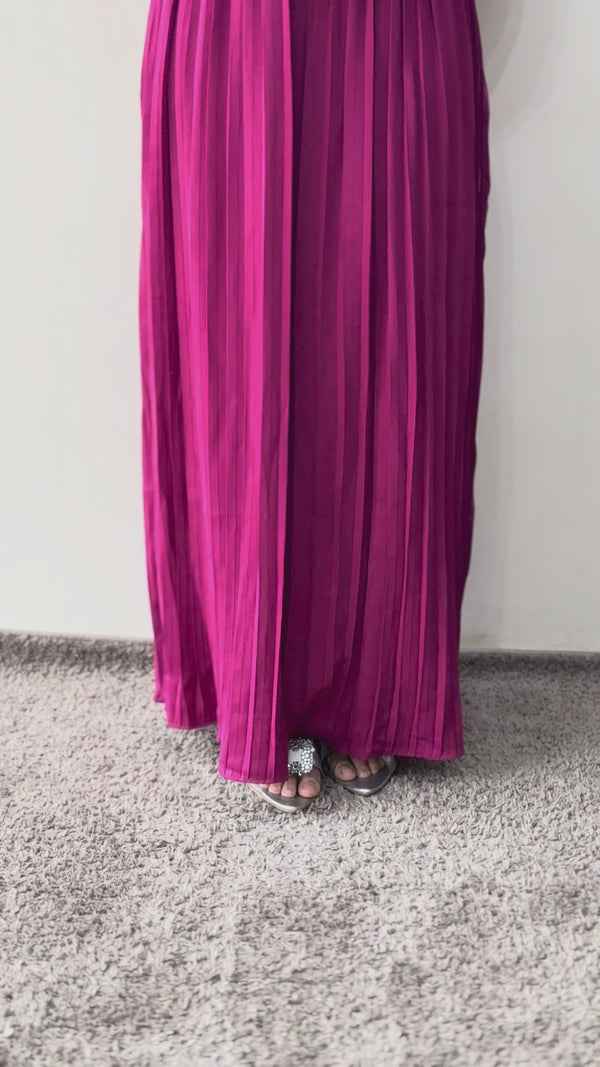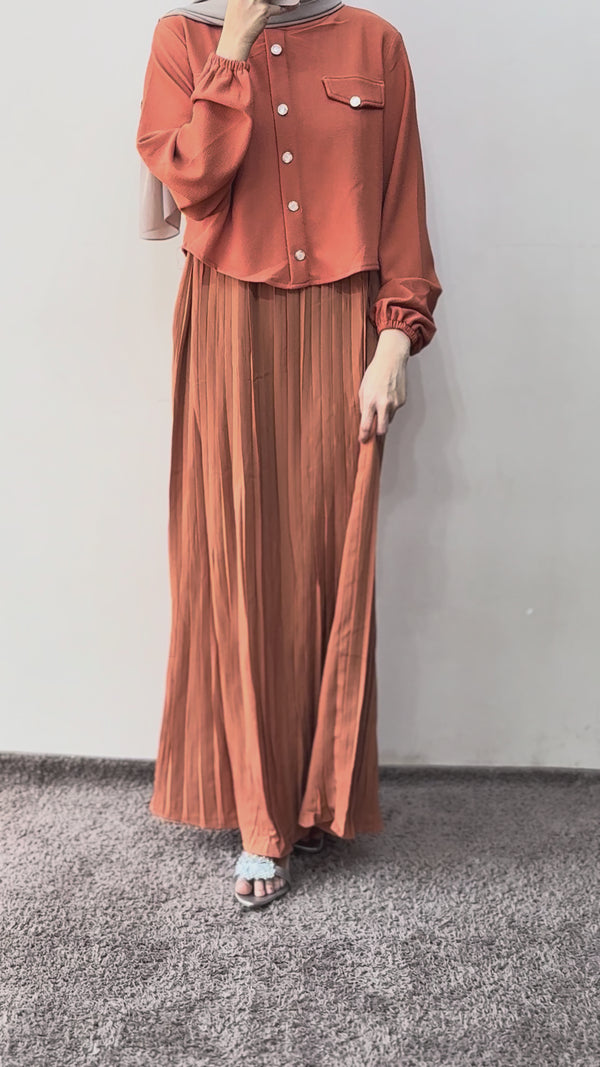 This pleated overcoat gown features a flowing maxi silhouette crafted from lightweight crinkle fabric for a textured look. Designed with a round neck and elasticated sleeves, it offers both comfort and style. The attached jacket detail with mock buttons adds a refined touch without compromising ease of wear. Suitable for casual occasions, this free-sized gown fits up to 2XL and requires dry or normal cleaning, making it a practical yet elegant addition to your modest wardrobe.