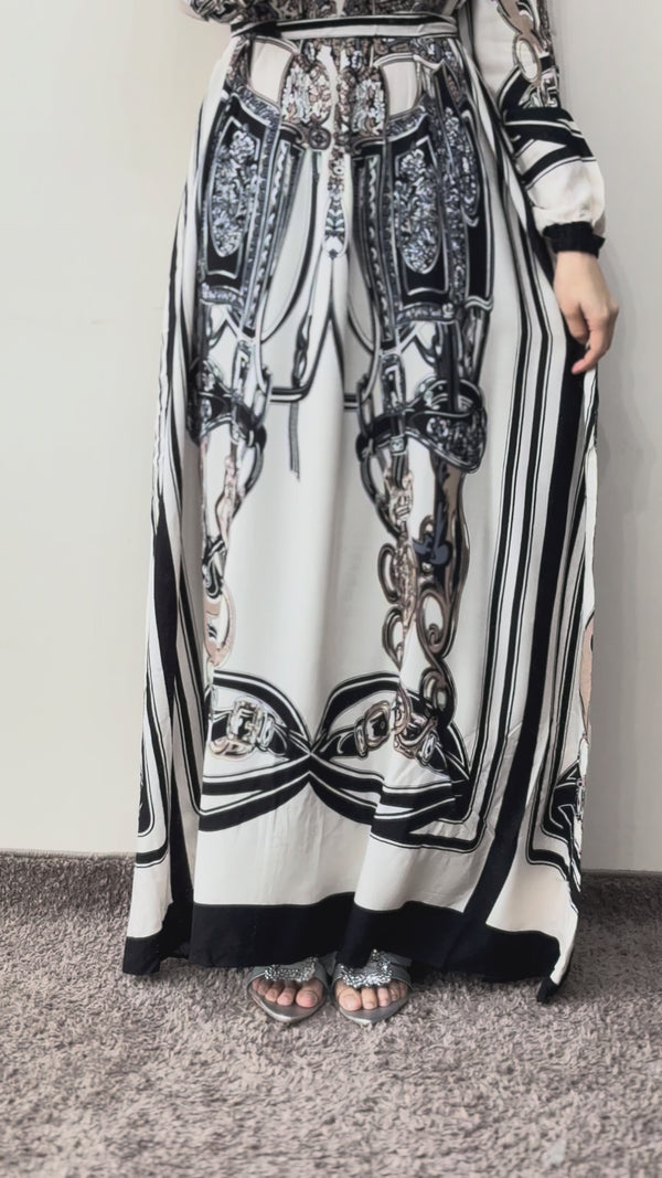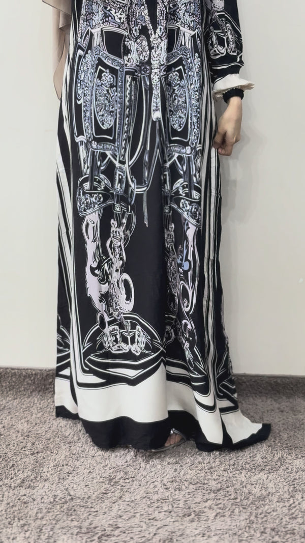 This flared maxi gown is crafted from rayon and features an intricate digital print with symmetrical ornate patterns and vertical borders. The gown is designed with a semi-collar neckline and long puff sleeves. This garment has a comfortable loose fit, is feeding friendly, and is suitable for casual wear.